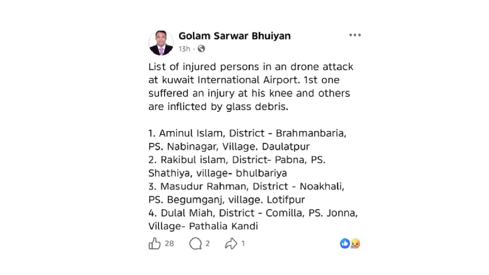 মহাপরিচালক গোলাম সরওয়ার ভুঁইয়া তার পোস্টে আহতদের সর্বশেষ বিস্তারিত তথ্য তুলে ধরে জানান, হাঁটুতে আঘাতপ্রাপ্ত বাংলাদেশি শ্রমিকের নাম আমিনুল ইসলাম। তিনি ব্রাহ্মণবাড়িয়া জেলার নবীনগর উপজেলার দৌলতপুর গ্রামের বাসিন্দা। বিস্ফোরণের তীব্রতায় কাচের টুকরোয় শরীরের বিভিন্ন অংশে আঘাত পাওয়া অন্য তিনজনের পরিচয়ও তিনি নিশ্চিত করেছেন। তারা হলেন—পাবনা জেলার সাঁথিয়া উপজেলার ভুলবাড়িয়া গ্রামের রাকিবুল ইসলাম, নোয়াখালী জেলার বেগমগঞ্জ উপজেলার লতিফপুর গ্রামের মাসুদুর রহমান এবং কুমিল্লা জেলার হোমনা উপজেলার পাথালিয়া কান্দি গ্রামের বাসিন্দা দুলাল মিয়া।